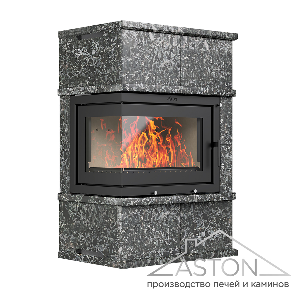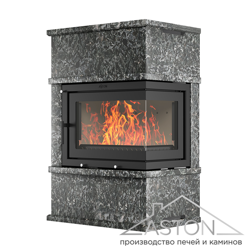 Облицовка сделана из натурального камня (Талькохлорит, Амфиболит или Пироксенит Элит на выбор), который быстро прогревается, хорошо держит тепло и обладает свойством медленно и равномерно отдавать энергию в окружающее пространство. Облицовка толщиной 40мм долго остаётся тёплой даже после окончания работы каминной топки. Индивидуальный красивый рисунок камня создаёт неповторимый дизайн. Объёмная резная поверхность плит дополняет индивидуальность камня, делает неповторимым внешний вид именно Вашего камина.