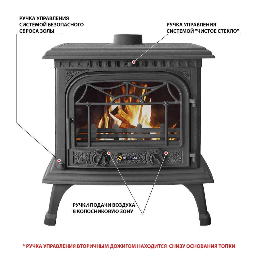 Над дверцей печи-камина расположена система чистое стекло, которая помогает оставаться стеклу чистым.