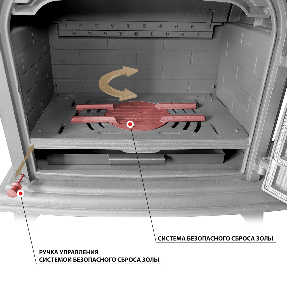 В нижней панели предусмотрена колосниковая решётка, которую можно привести в движение с помощью ручки, которая выведена на корпус печи. за счет этой функции появилась возможность безопасный сбрасывать золу в зольный ящик
